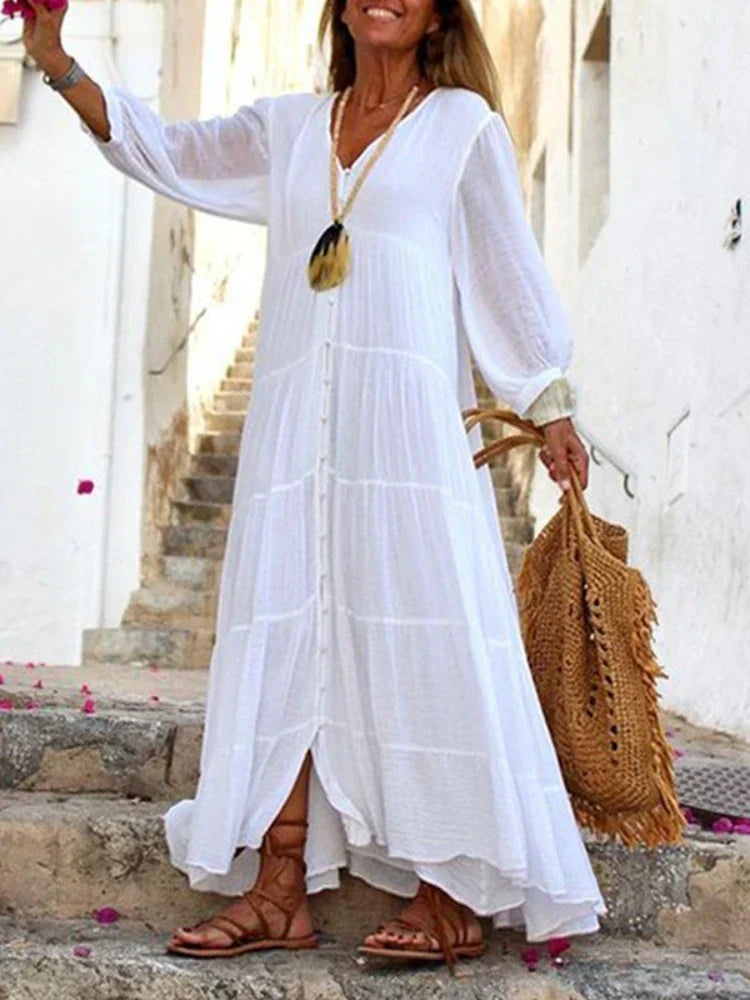 De elegante knoopsluiting, lange mouwen en zwierige laagjes zorgen voor een moeiteloos vrouwelijke look. Van ochtendwandeling tot avondborrel – deze jurk doet het altijd goed.